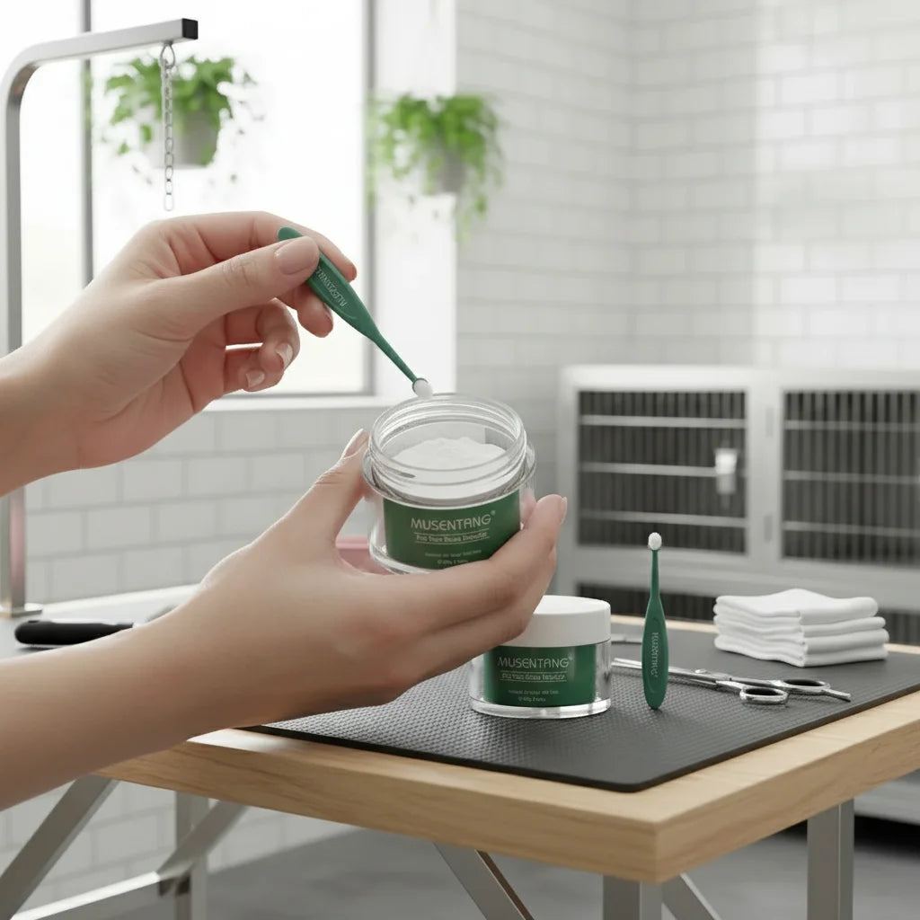 With the gentle applicator brush, take a small, delicate amount of powder. Lightly dust it directly onto the stained fur, being careful to avoid direct contact with their eyes. This precise application ensures the natural formula works effectively to transform their appearance, bringing pristine clarity.